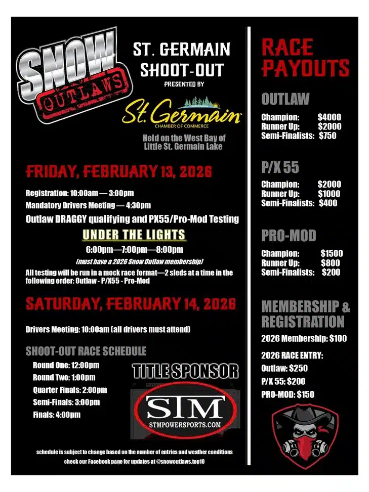 Mark your calendars for the St. Germain Shoot-Out, taking place on February 13th and 14th. Proudly presented by the St. Germain Chamber of Commerce, this exciting event will be held on the West Bay of Little St. Germain Lake.